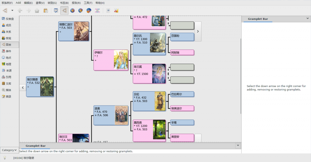 这是一个收录托尔金笔下《精灵宝钻》中主要人物基本信息和相互关系的数据库,使用 GrampsAIO 创建。GrampsAIO 是一个免费的系谱学研究软件,通过它,你可以以多种方式对人物的相互关系进行探索并可视化(参见截图)。本作品采用知识共享署名-非商业性使用-相同方式共享 4.0 国际许可协议进行许可。