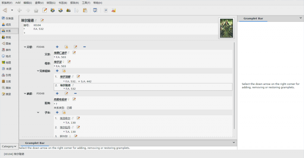 This is a database containing main characters’ basic information and their relationship to each other in J. R. R. Tolkien’s The Silmarillion. It was created with GrampsAIO, a free genealogy research software. With GrampsAIO, you can explore and visualize characters’ relationship in various ways (screenshots below).