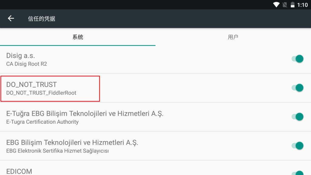 - 重启模拟器后,在系统设置-安全-信任的凭据-系统分区,可见到 Fiddler 的根证书: