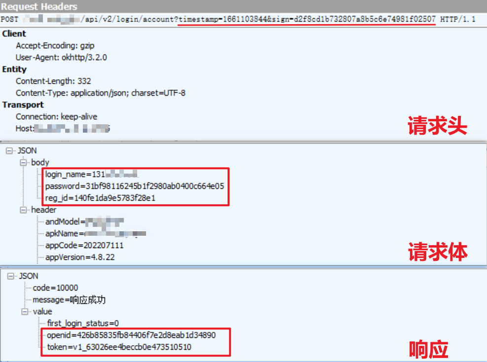 首先来看登录请求。URL 参数中,timestamp 显然是当前的 Unix 时间戳,sign 参数的生成算法未知;请求体中,login_name 是注册手机号,password 是经过处理的密码(其实简单猜想并验证一下就能发现是密码的 MD5 哈希),reg_id 的生成算法未知,其他参数都是软件版本之类的非关键信息。