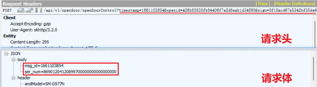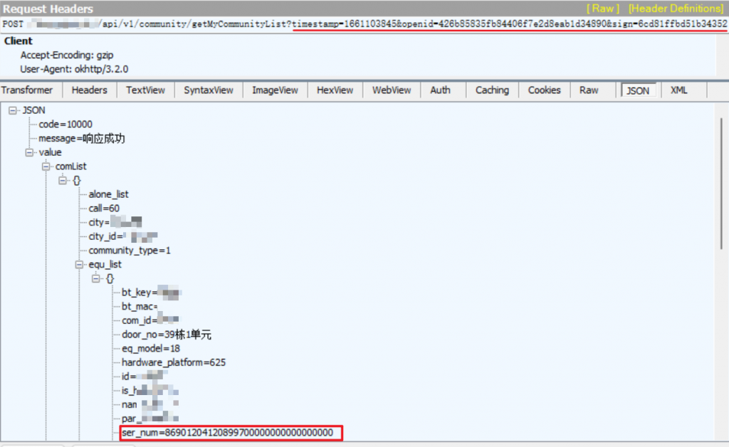 最后来看开门接口。URL 中的参数与上一步相同,请求体中 msg_id 也是 Unix 时间戳,ser_num 即上一步中获取的要打开的单元门的序列号。