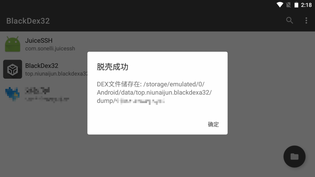 在模拟器中安装 BlackDex 32 位版本,运行后直接点击要脱壳的 App 名即可:
