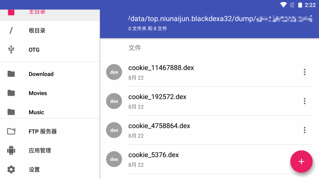 到 BlackDex 提示的路径即可找到脱壳后的 dex 文件(可能有多个),将其全部导出至 PC,准备后续逆向分析。