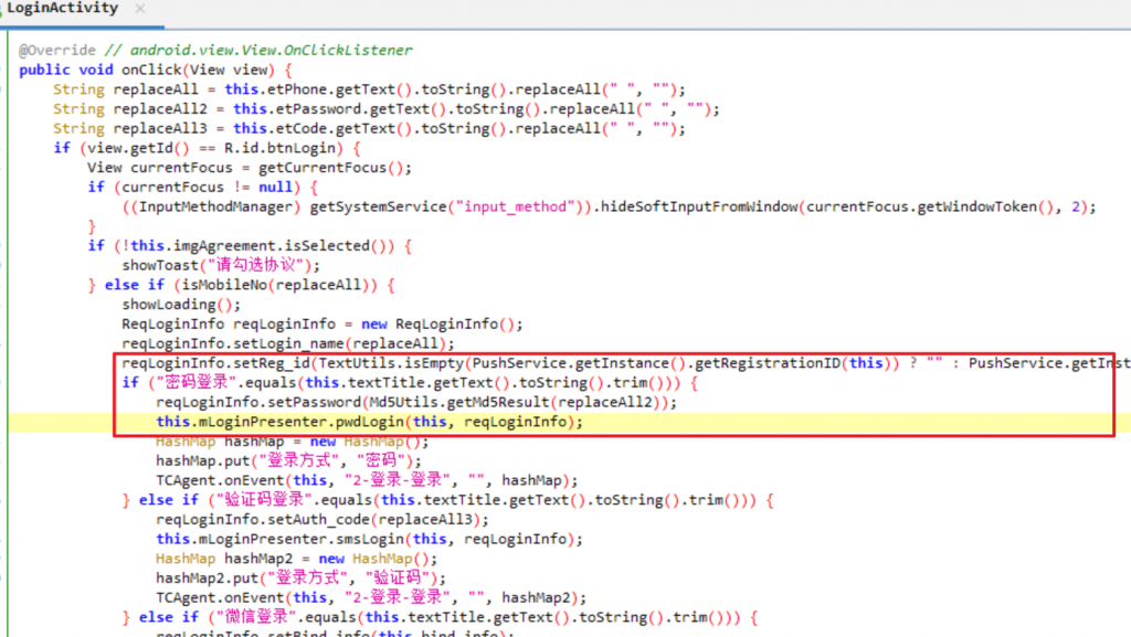 用 jadx 打开脱壳后的所有 dex 文件进行反编译,通过关键词搜索,定位到 LoginActivity 类的如下方法: