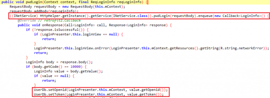 可以看到,该方法调用了 HttpHelper 类的方法进行网络请求,然后将服务器返回的 openid 和 token 两个参数保存在数据库中。然而 sign 参数的生成过程并没有出现,因此其签名算法必然是在 HttpHelper 类中实现的。我们接着打开 HttpHelper 类的实现: