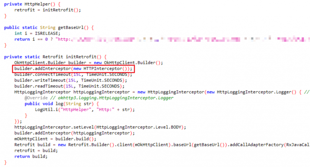 可以看到,该类内部采用 retrofit + okhttp 框架来处理 HTTP 请求,其中,红框内的代码为网络框架添加了一个拦截器。拦截器通常用来修改网络请求的内容,因此与签名、鉴权有关的算法大概率就在拦截器的代码中。我们接着打开 HTTPInterceptor 类的实现: