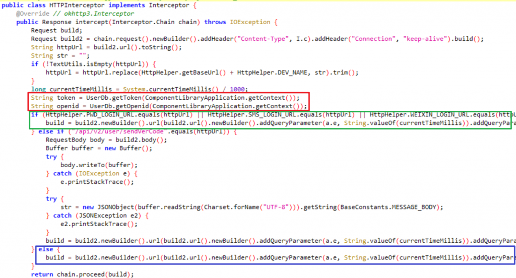 可以看到,拦截器首先在红框代码中获取了登录时保存的 openid 和 token 两个参数,然后判断请求的 URL,对于登录请求会执行绿框内的代码,我们关注的其他两个请求则都落到 else 分支的蓝框代码中。