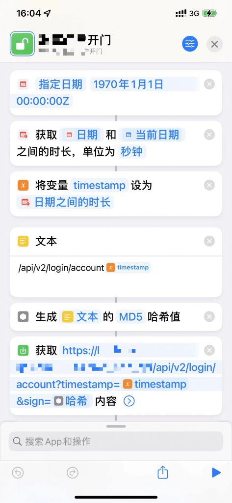至此,App 开门相关的所有请求及鉴权流程已经分析完成,总体而言还是比较简单,仅涉及到 MD5 哈希算法,因此可以通过很多种方式进行重现,达到快速开门的目的。由于常用机是 iPhone,这里我使用 iOS 的「快捷指令」重写上述逻辑,从而达到了在 iPhone 通知中心直接点击运行该指令,即可打开单元门的效果。
