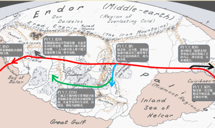 A chart made to demonstrate the Great Journey in J. R. R. Tolkien’s The Silmarillion, in which the elves of the Middle-Earth travelled west towards Aman and seperated to several tribes.